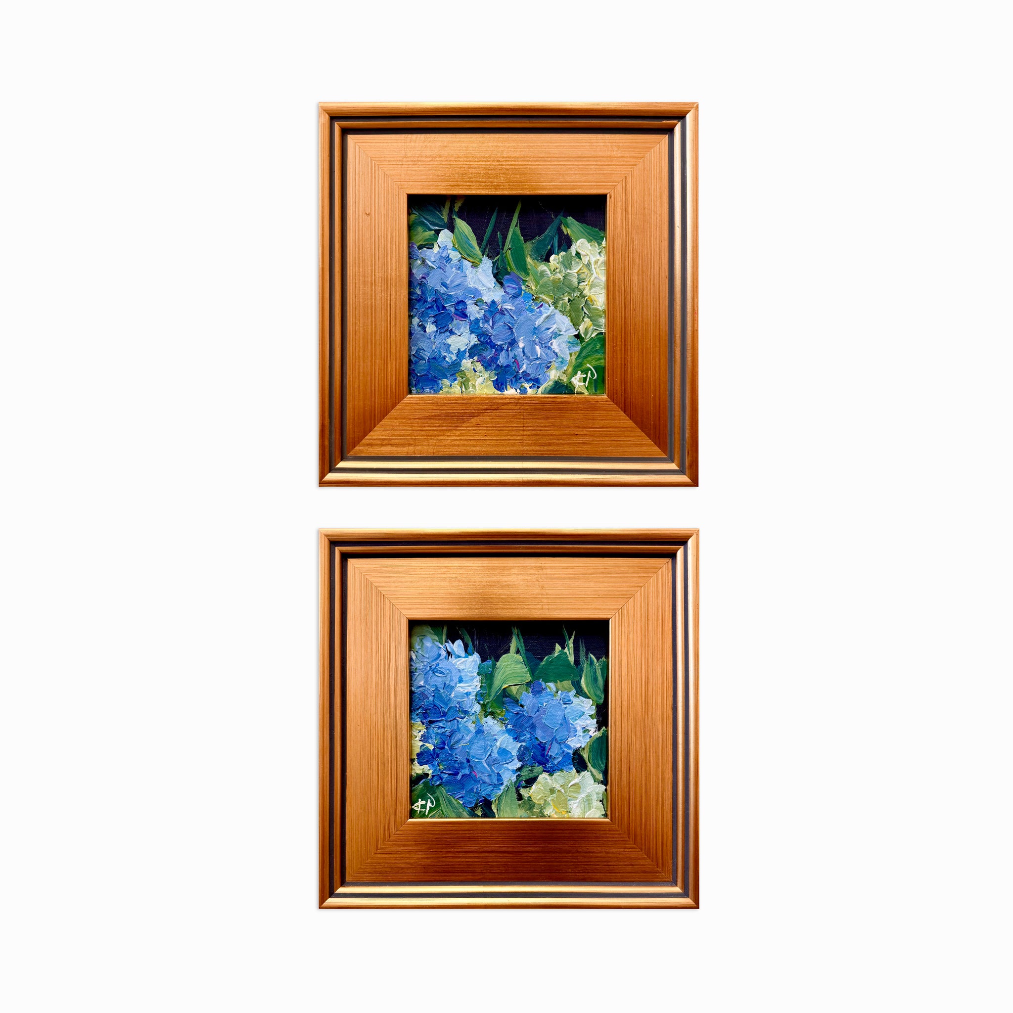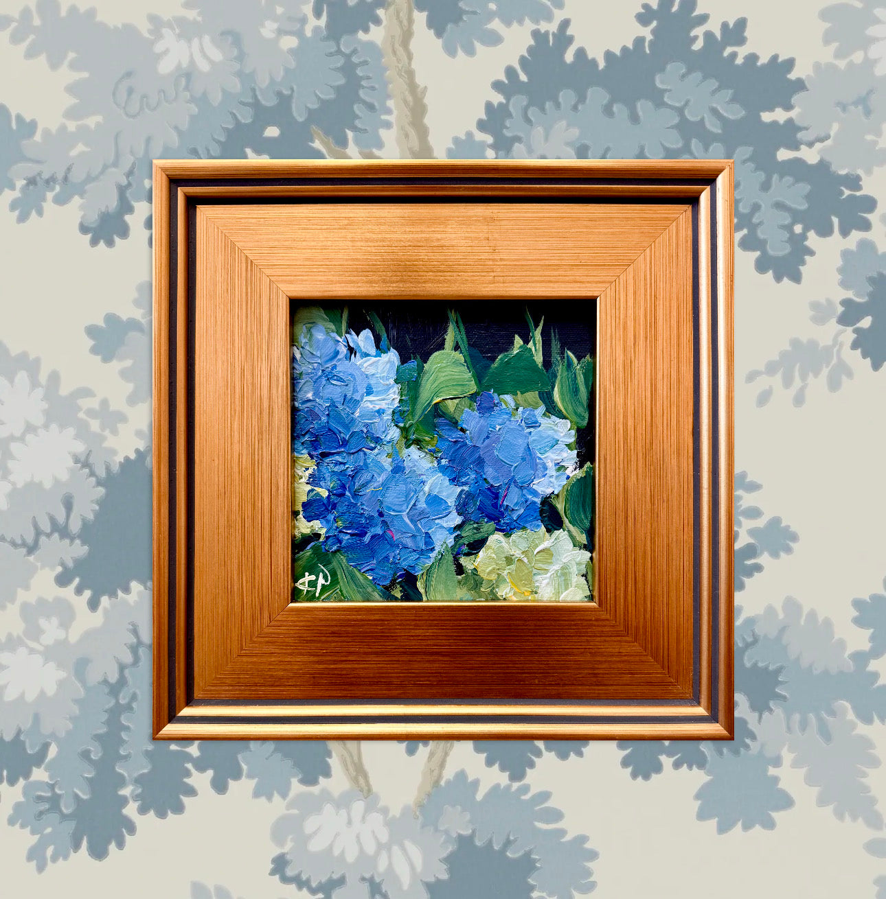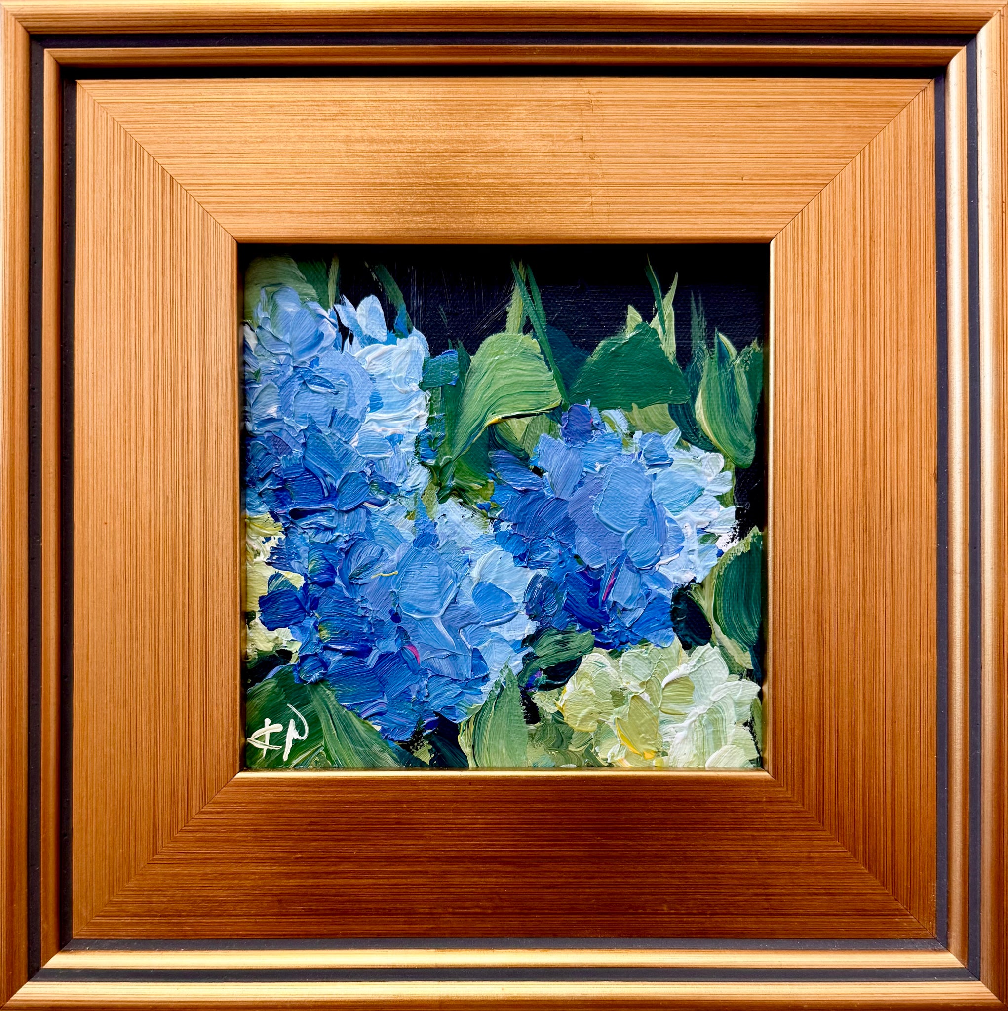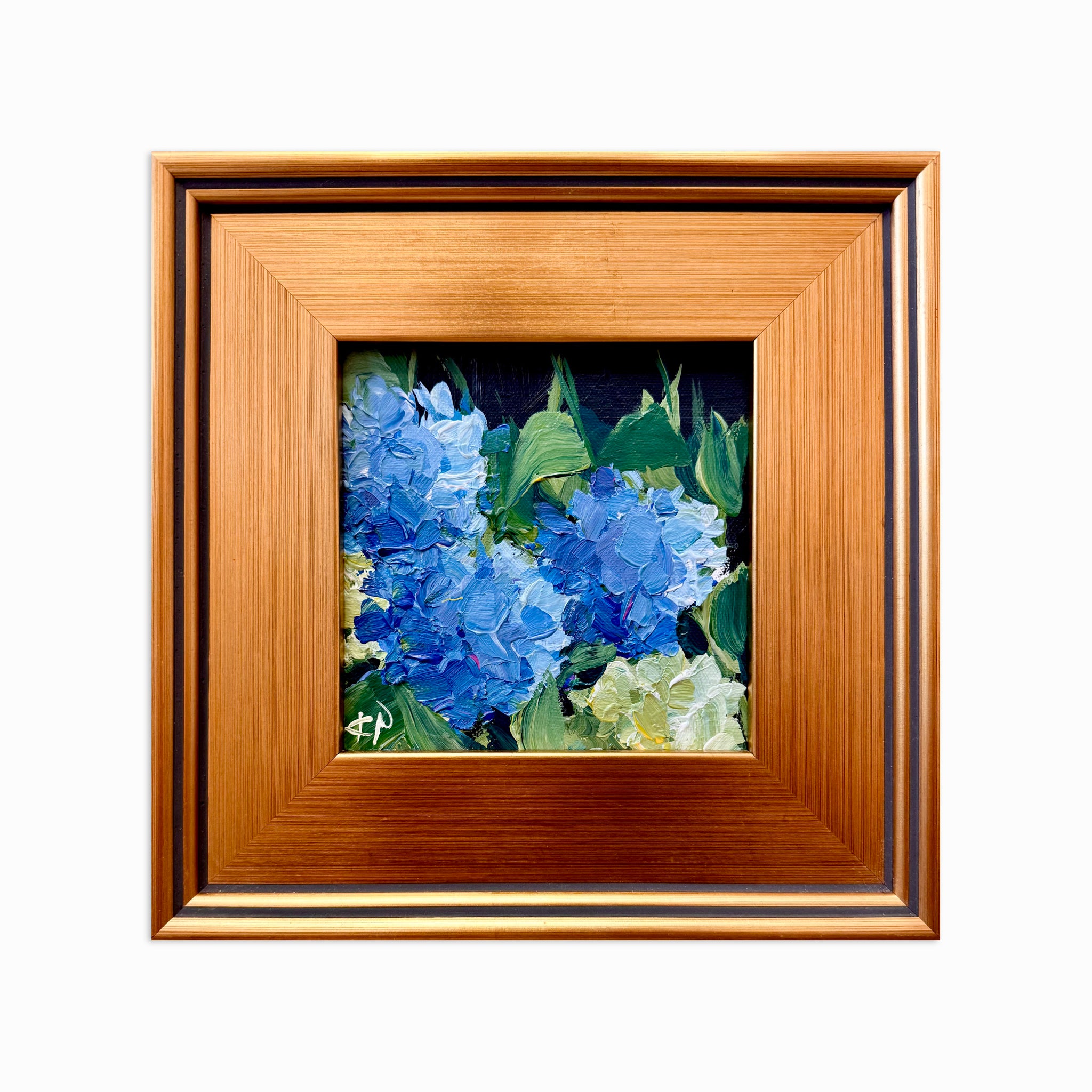 Framed in a lightly aged / distressed gold gallery frame and wired for hanging
