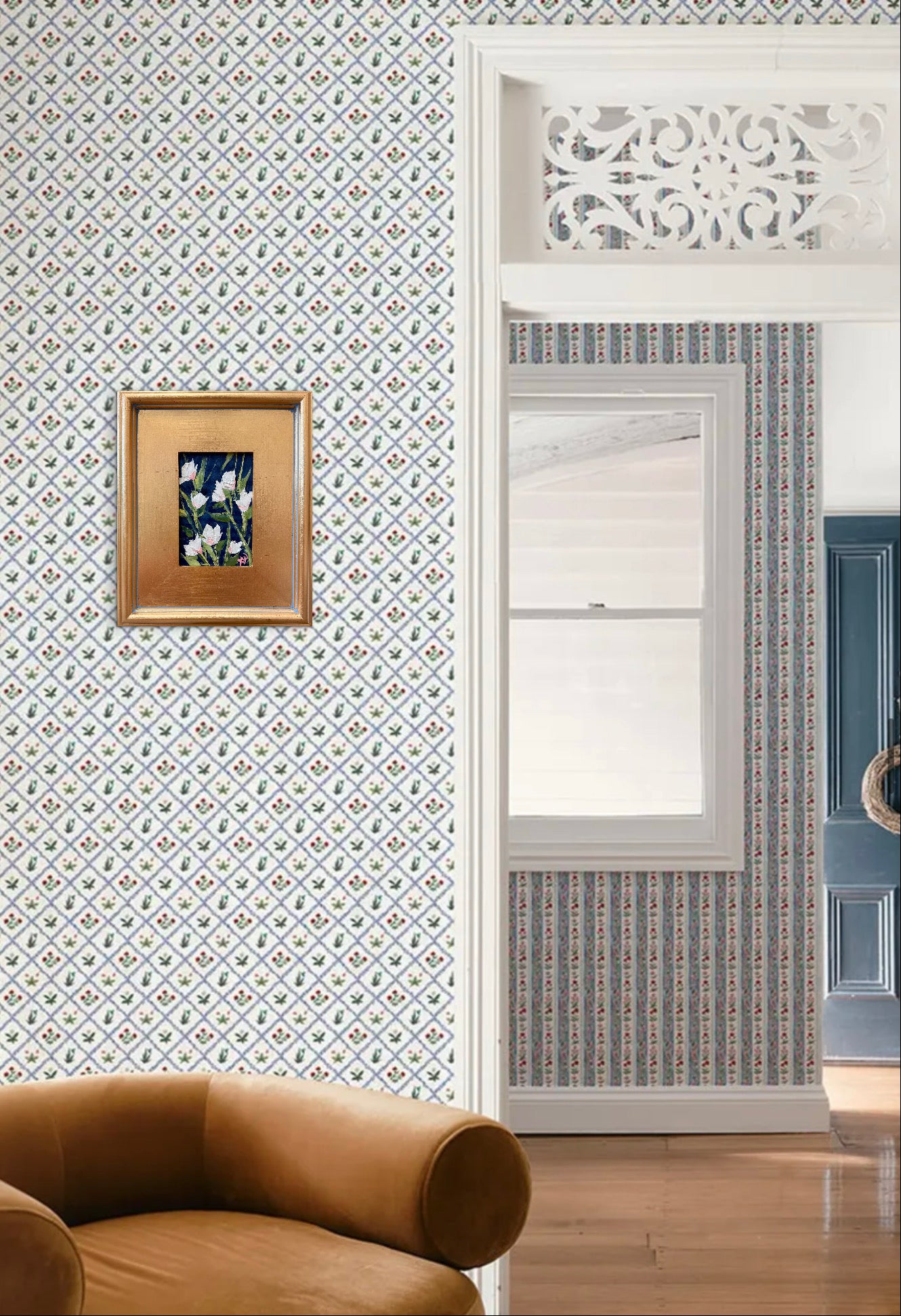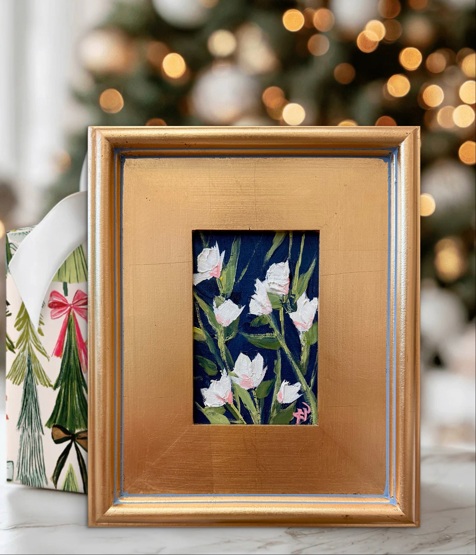 Framed in a lightly aged / antiqued gold gallery frame and wired for hanging