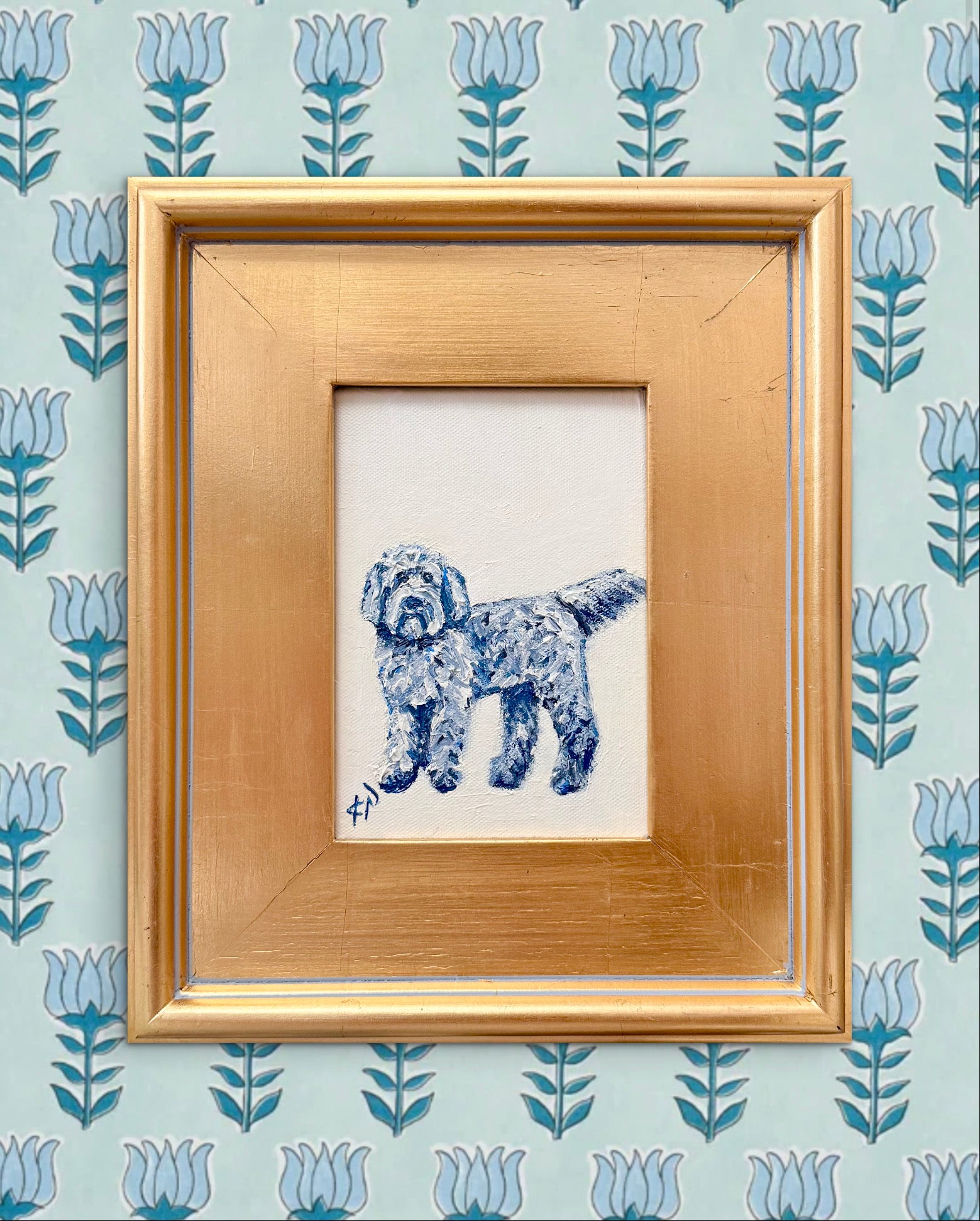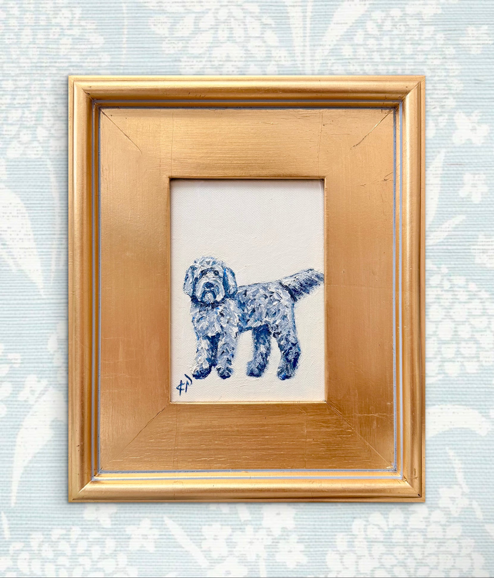 Framed in a lightly aged / antiqued gold gallery frame and wired for hanging