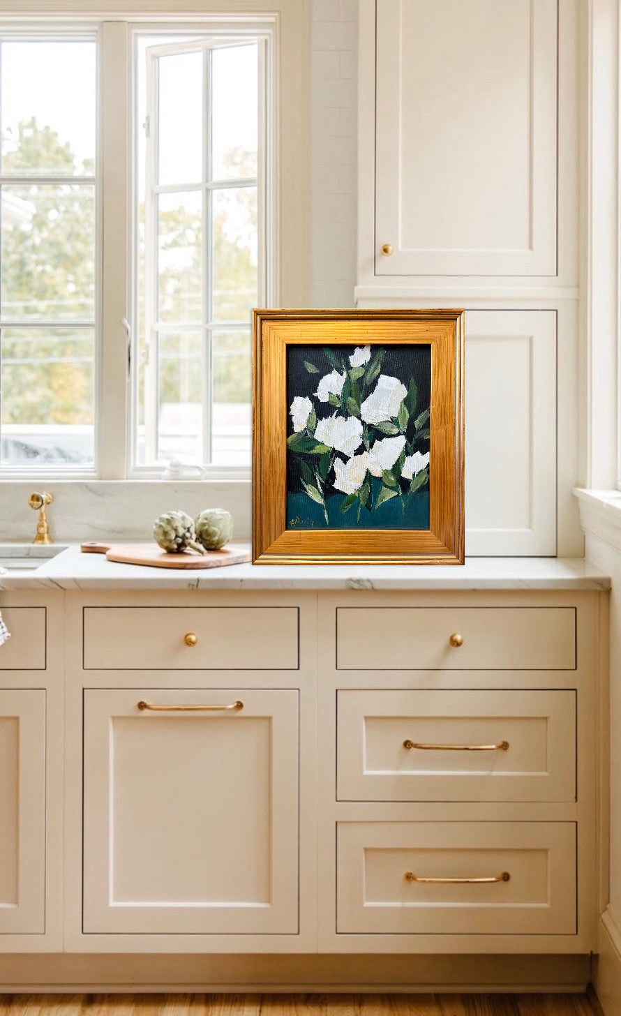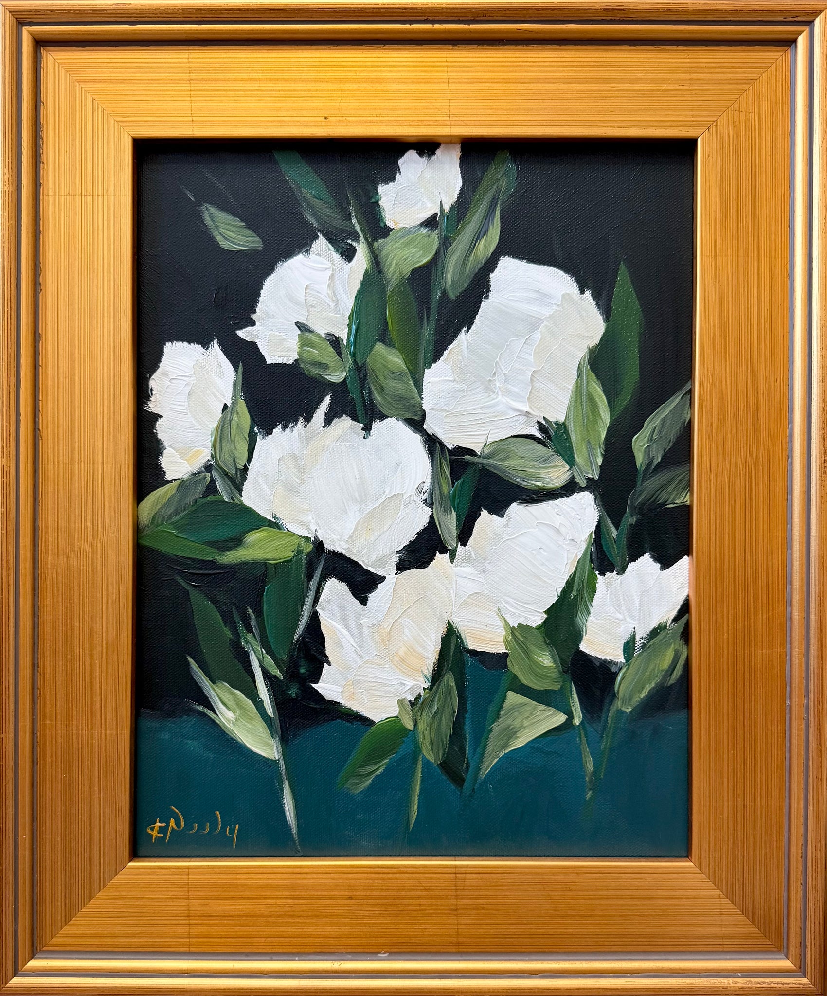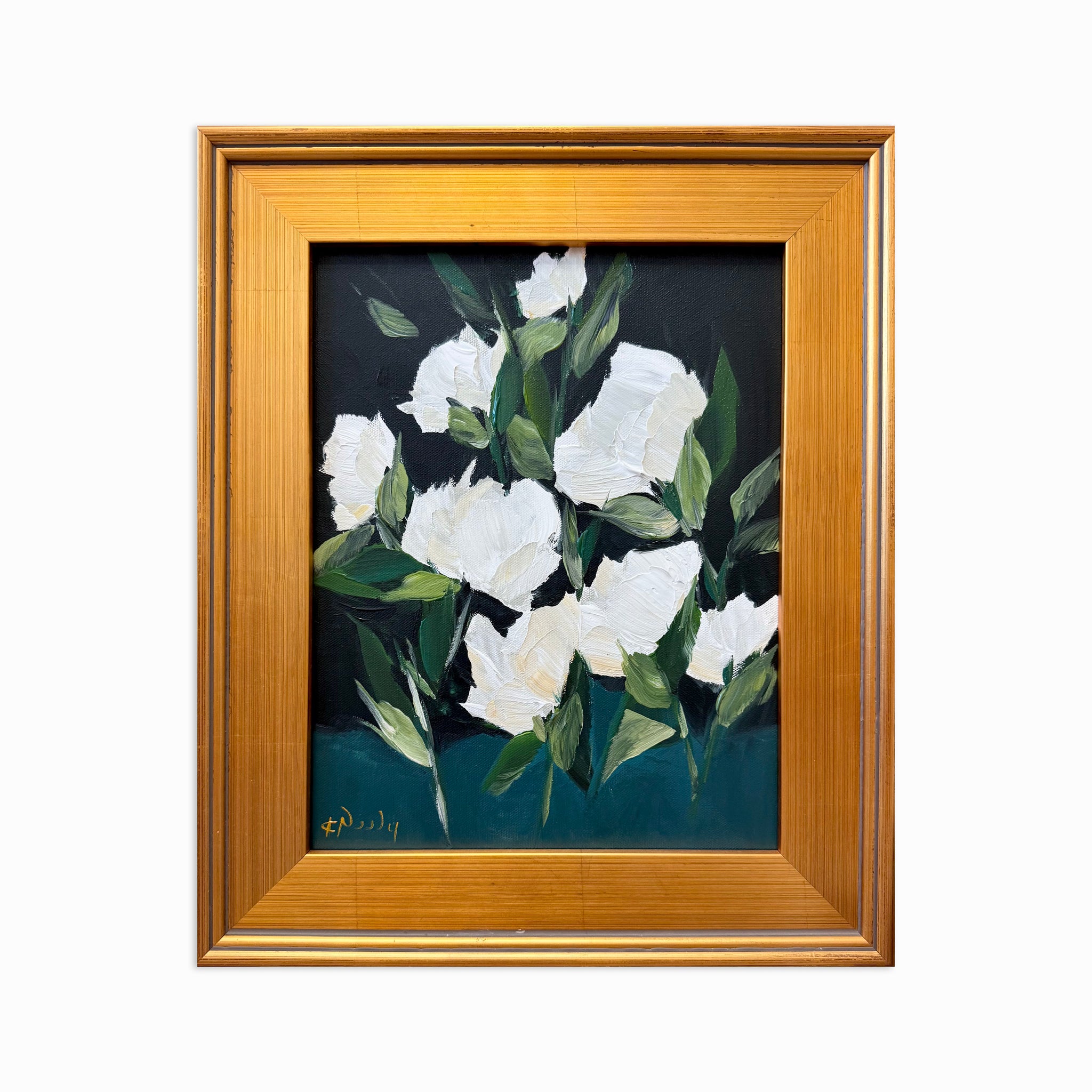 Framed in a lightly aged / distressed gold gallery frame and wired for hanging
