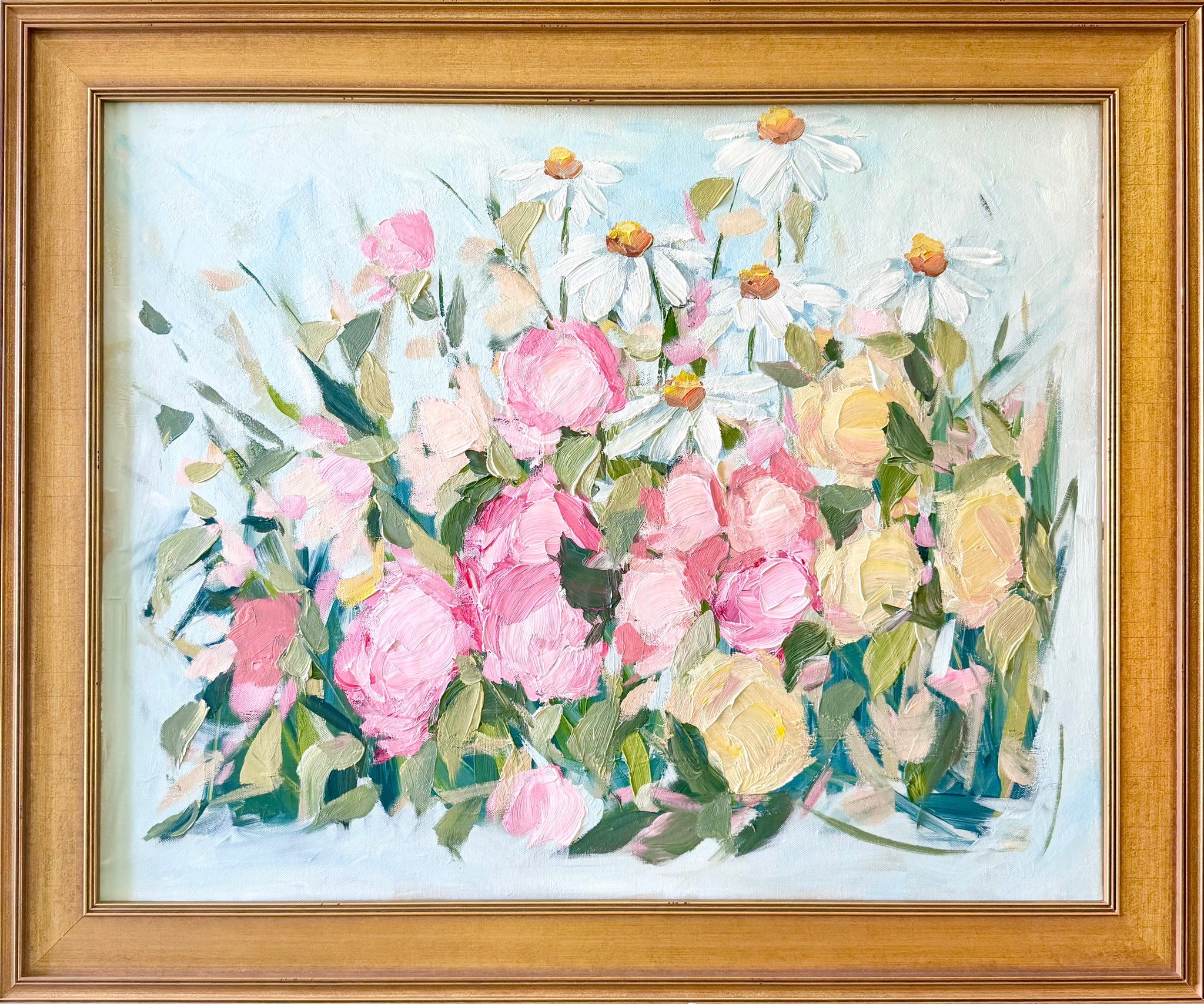 Framed in an antiqued gold gallery frame and wired for hanging