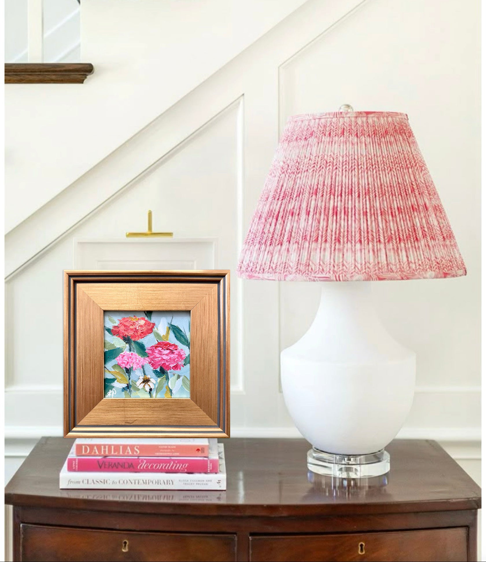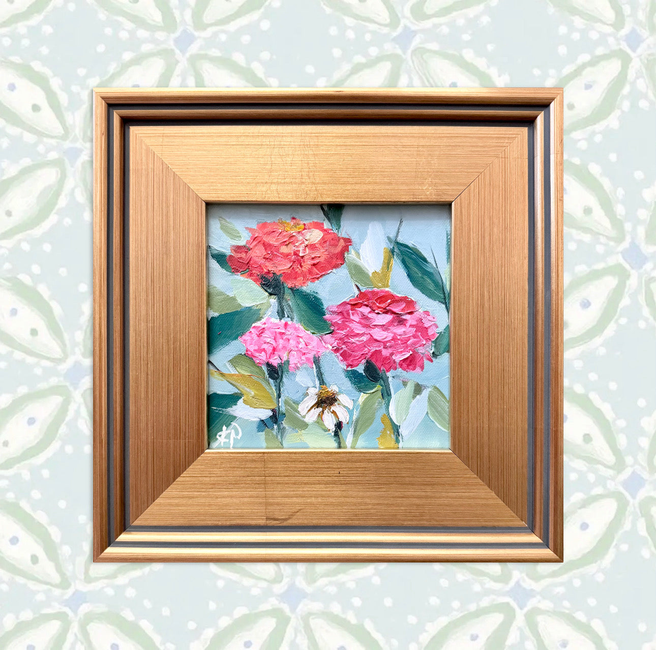 Framed in a lightly aged / distressed gold gallery frame and wired for hanging